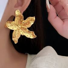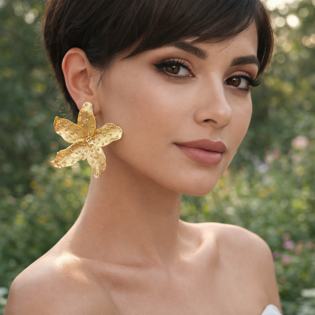 The Gold Orchid Statement Stud Earrings are a love letter to the most exotic of flowers, translated into bold wearable art. Each oversized stud is shaped as a five-petal orchid bloom — the petals cupped and slightly asymmetric, just as a real orchid would be — and finished with two distinct surface textures: fine linear striations running along each petal, and a scattering of raised gold dots that catch the light like dewdrops on a bloom.