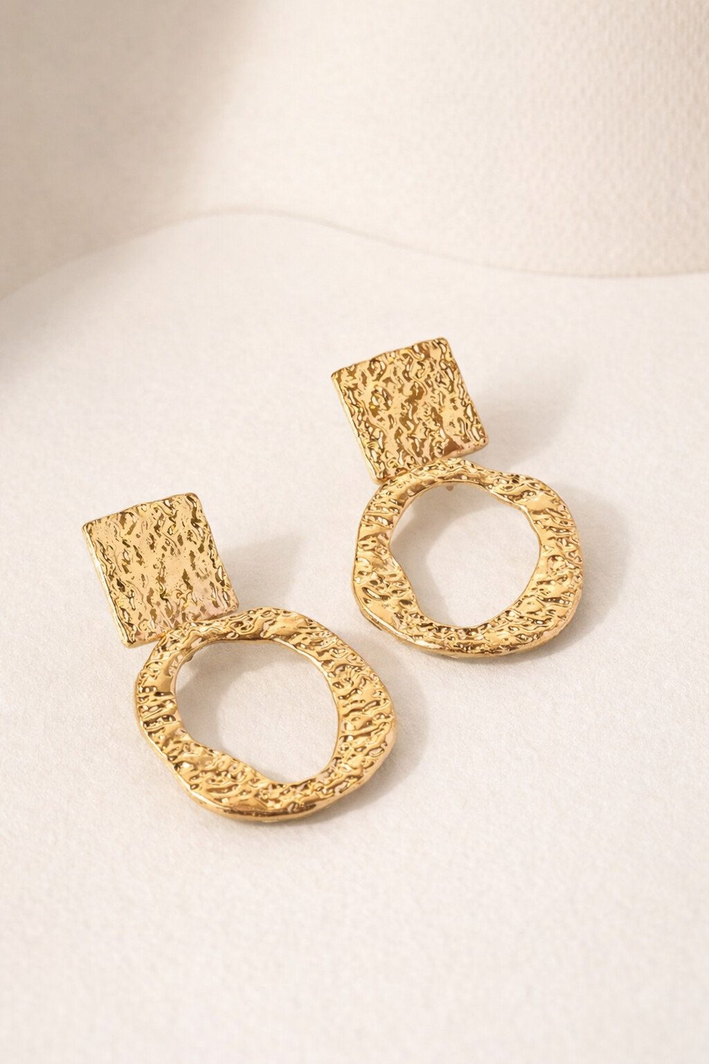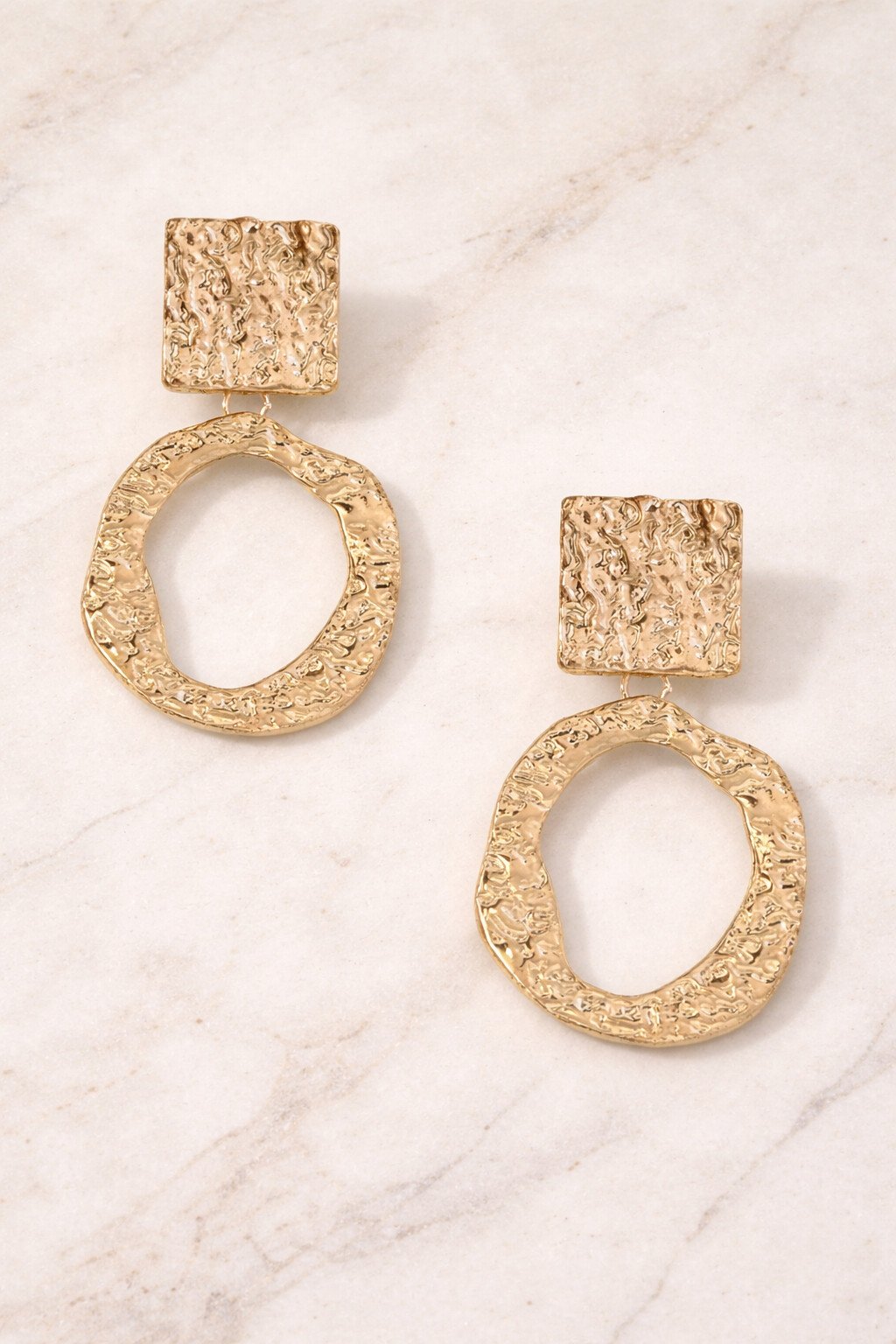 The Hammered Geo Drop Earrings are where modern geometry meets artisanal craft. Each earring features a square stud top with a richly textured, hammered surface — almost molten in appearance — from which a larger open hoop pendant is suspended. The hoop itself is organic and irregular in shape, deliberately imperfect in a way that feels intentional and contemporary.
