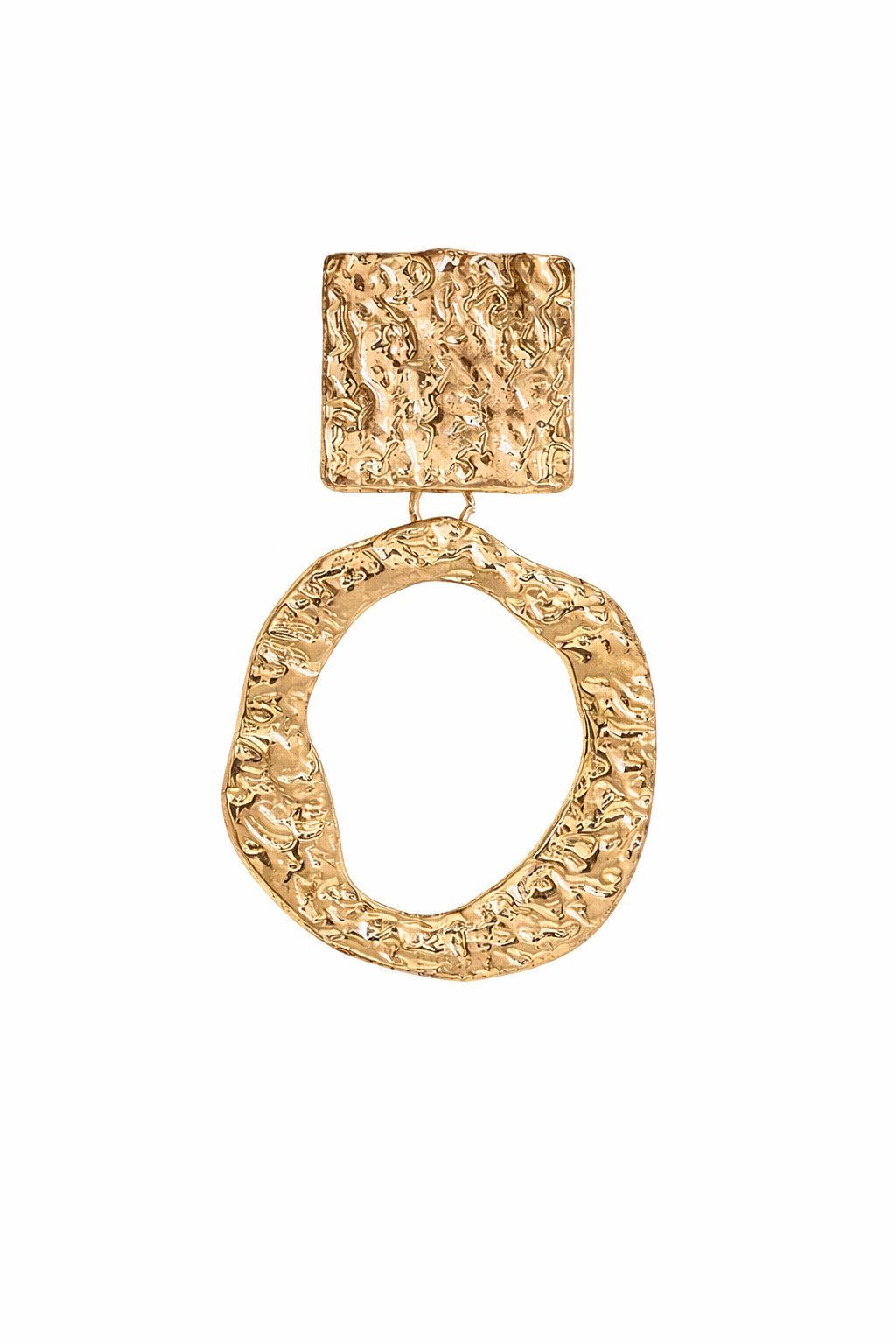 Raw meets refined — a hammered gold square stud anchors an open organic hoop below, all wrapped in deeply textured molten-effect metal for an effortlessly sculptural statement.
