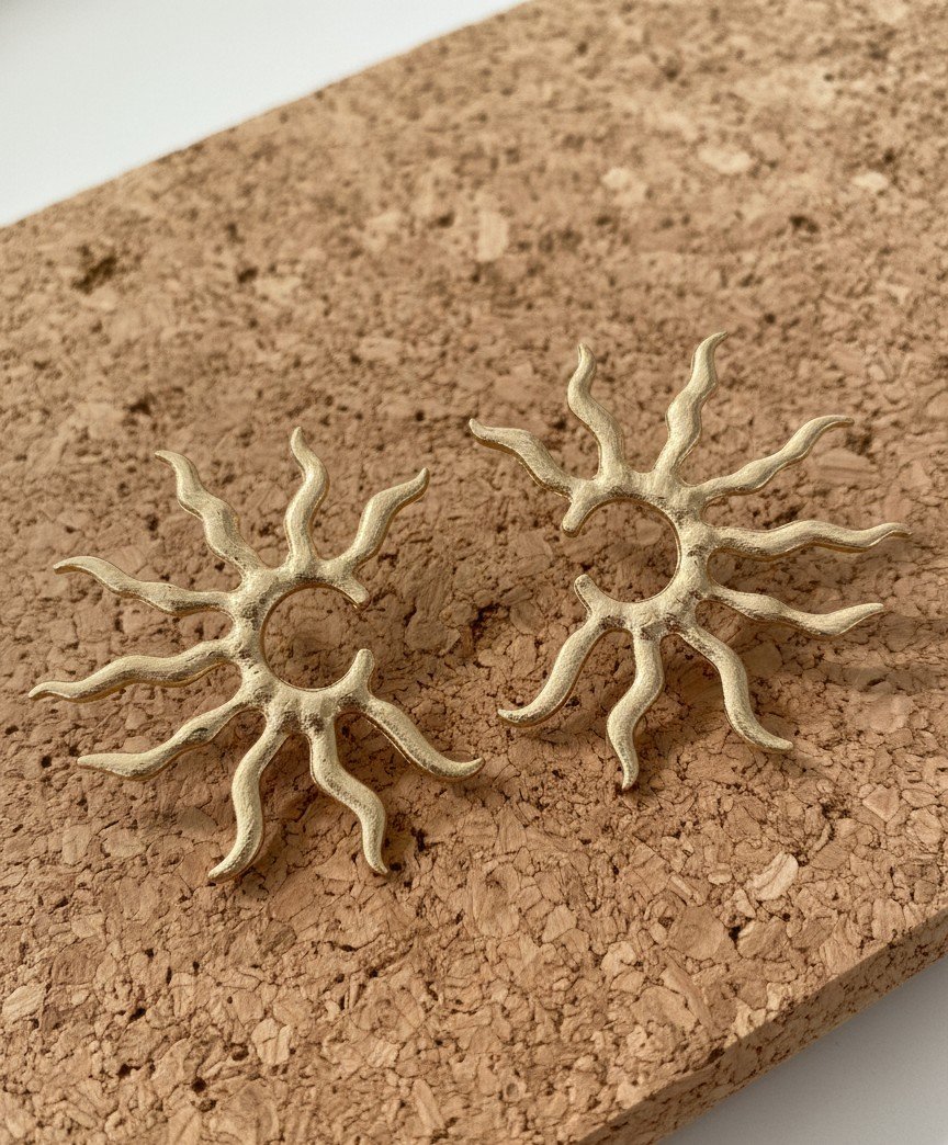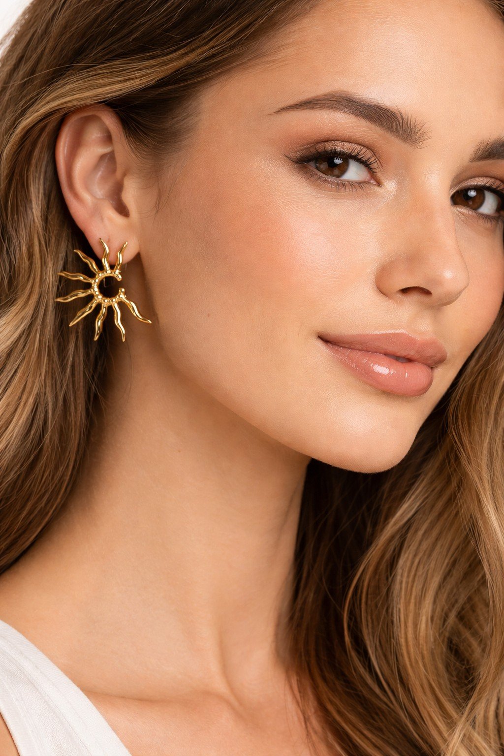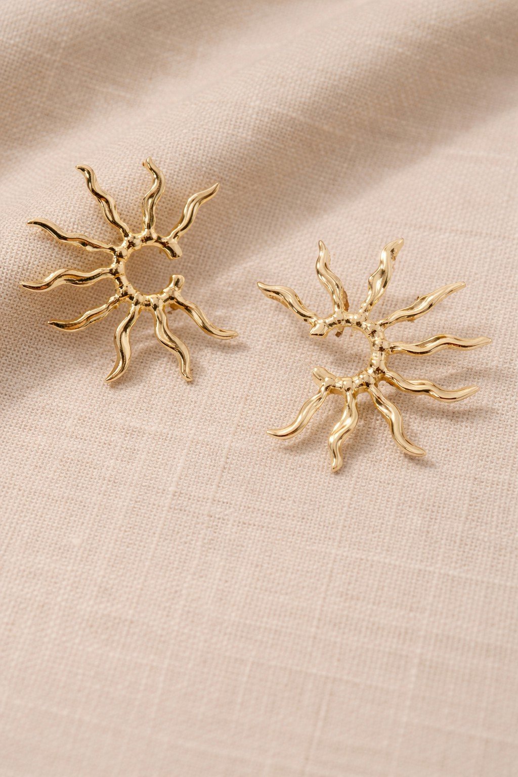 Wear the sun on your ear — bold gold sun studs with fluid, flame-like rays radiating from an open centre, crafted in a polished gold-tone finish that catches light like a midday glow.